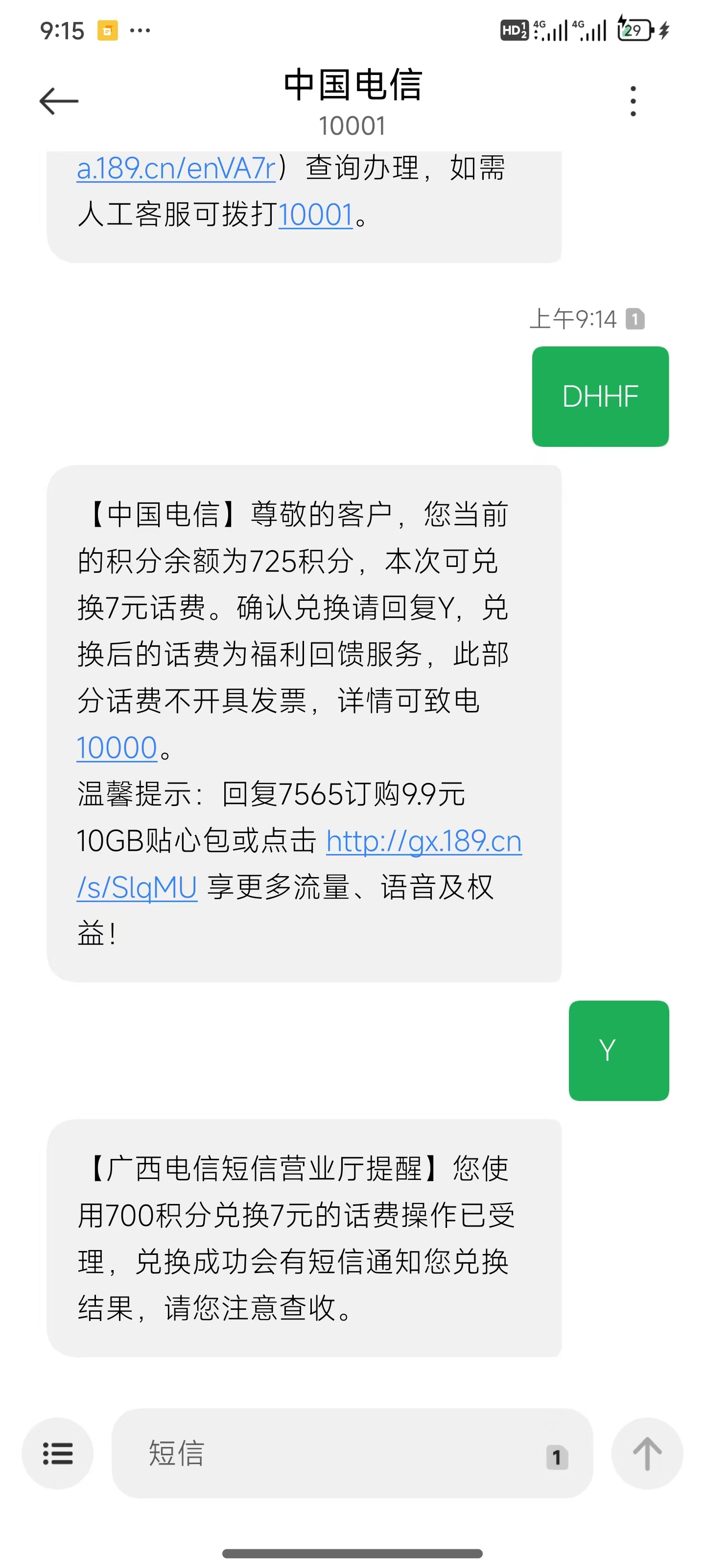 编辑短信 DHHF 发送到 10001。如下图